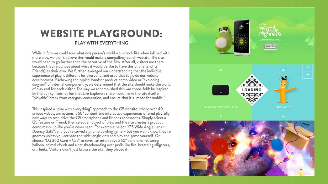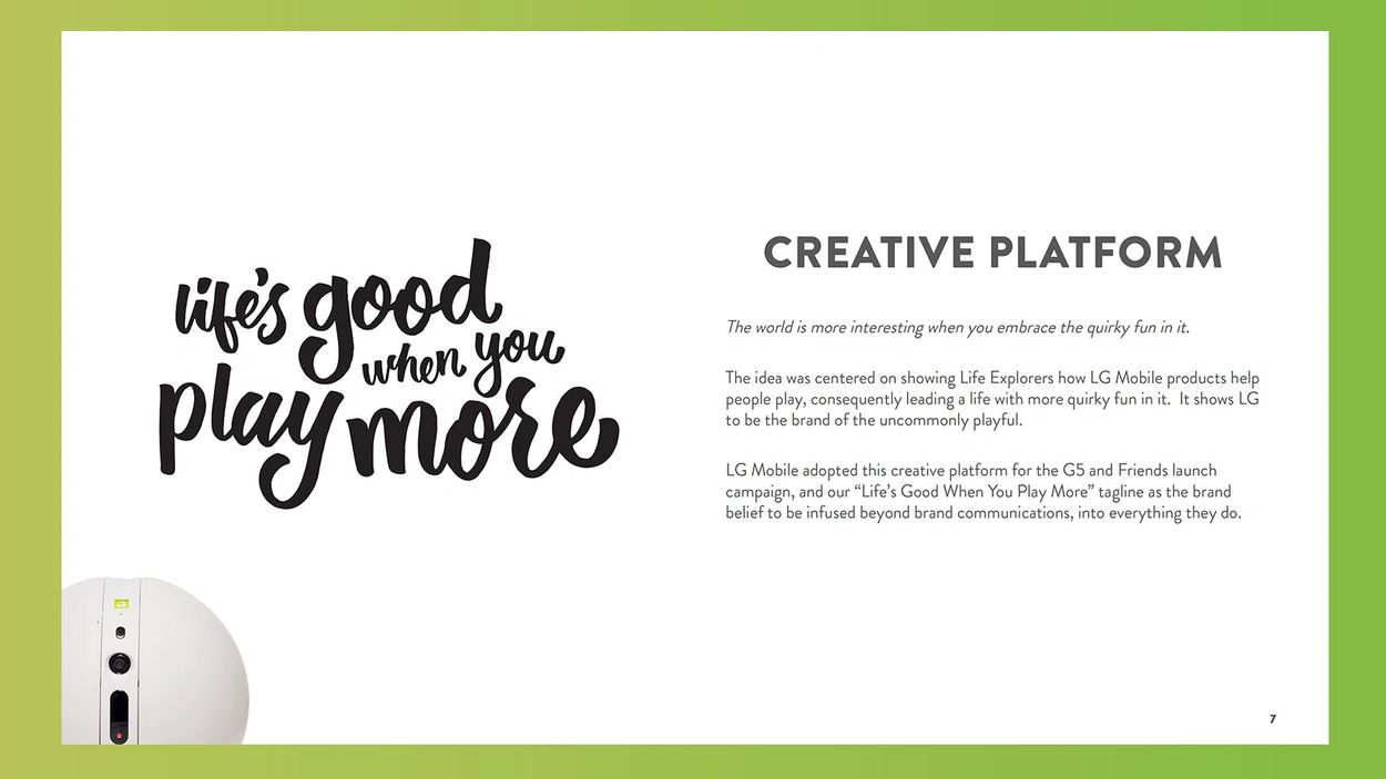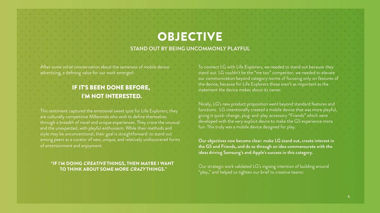 Our campaign needed to show how the LG G5 and Friends (peripherals) help people play, and enjoy a life with more quirky fun in it. We articulated this with a tagline in the LG "life's good" parlance: "Life's Good When You Play More". This inspired campaign executions that challenged conventional thinking in film and offered a variety of "playable" breaks from category conventions online.