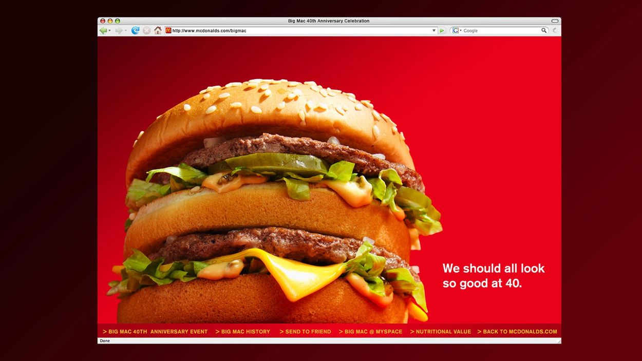 Occasionally we would have a brand milestone to celebrate. Our campaign for the 40th anniversary of the Big Mac heralded a new era of product photography and adoption of the "simple bold" visual style developed for packaging and POS. I wrote and designed this landing page for McDonalds.com in the car, en route to a short-notice meeting with the marketing clients. They loved it.